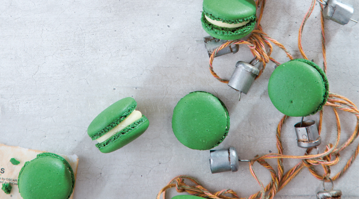 To assemble, pipe some ganache on the flat side of half of the macarons, then sandwich them together.