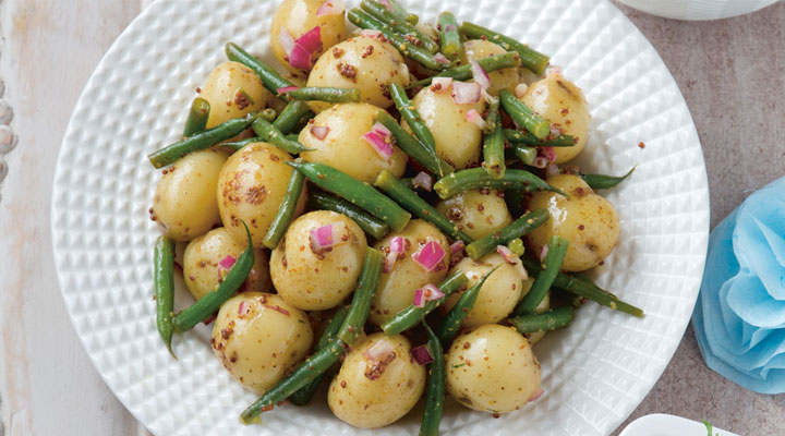 Put all the dressing ingredients together in a screw-top jar and shake vigorously. Steam the potatoes until cooked but still firm. Tumble into a bowl and pour over half the dressing while still warm. Steam the beans and add to the potatoes along with the red onion and dill. Add the rest of the dressing, season with salt and pepper and toss well.