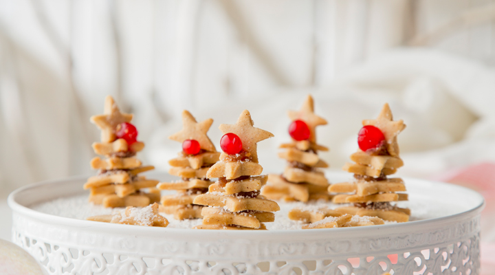 8. To assemble, arrange 20 of the large stars on a serving platter or board. Spoon a raisin-sized piece of the date filling in the centre. Sit a large star on top of each one, staggering the points and pressing them down lightly. Repeat with another large star, then follow with two medium stars. Place a dot of the date filling on top of each one, then place the final medium star standing upright in it. Dust the fine coconut over, place a redcurrant berry beside the star on top and serve.