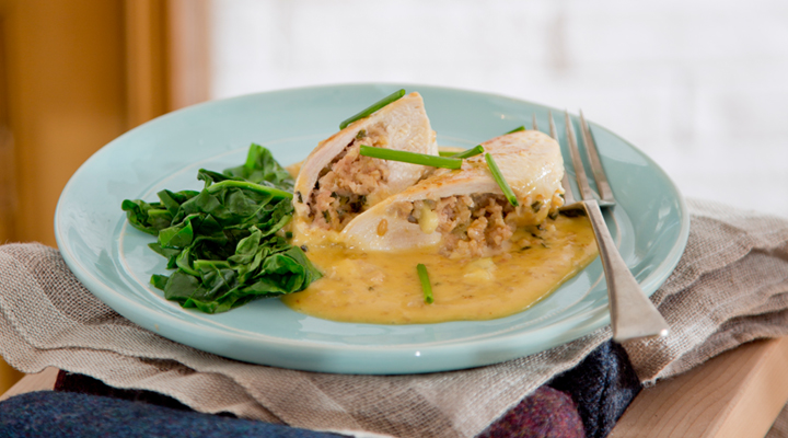 5. Cut each stuffed chicken breast in half on the diagonal and place on plates. Pour over the sauce and serve with a mound of lightly wilted spinach on the side and some boiled or steamed potatoes. Garnish with a few fresh chives.