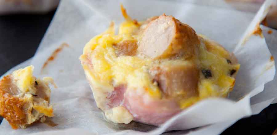 Whisk the eggs and milk together in a bowl. Add the sausage bits and cheese and season with salt and pepper. Evenly pour the egg mix into each cup and transfer to the oven. 5 Bake for 10 to 15 minutes, until the eggs are set. Remove from the oven and serve as individual portions.