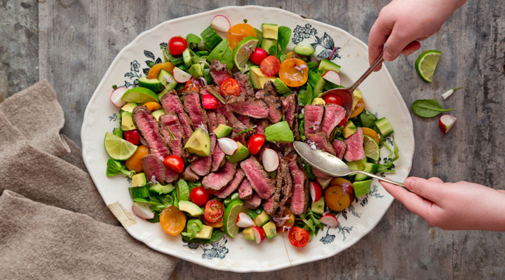 Place the steaks and apricots on the barbecue. Cook for 2 to 3 minutes on each side for medium, depending on how thick the steaks are. Remove from the heat and set the beef aside to rest for 2 to 3 minutes. Slice and serve immediately with the avocado and red onion salad.