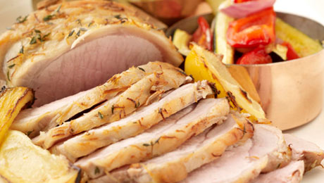 Lemon, Garlic and Thyme Roasted Pork Loin, Mediterranean Vegetables and Mini Roast Potatoes