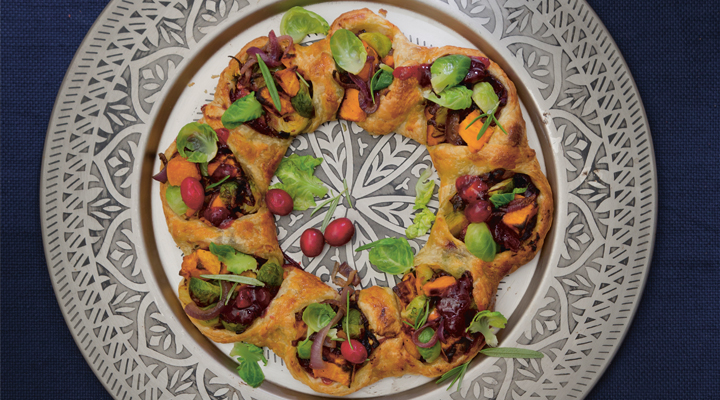 This Christmas wreath would be ideal for a mixed vegetarian and meat dinner, as it can act as a main course for a meat-free option and as a time-saving combination side dish for meat eaters