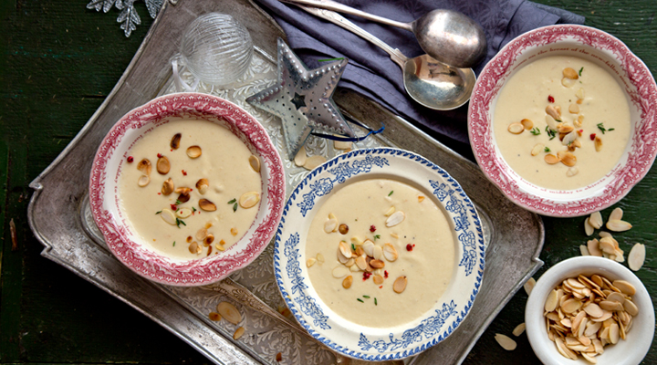3. Serve the soup piping hot in warmed soup bowls. Garnish with the toasted flaked almonds.