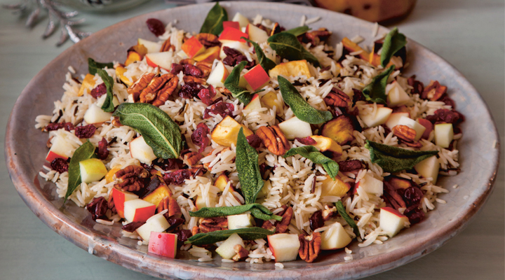 To serve, mix the rice, parsnips, pecans, apples and the remaining cranberries in a large bowl or serving platter. Dress with the cranberry dressing and sprinkle over the crisp sage leaves.