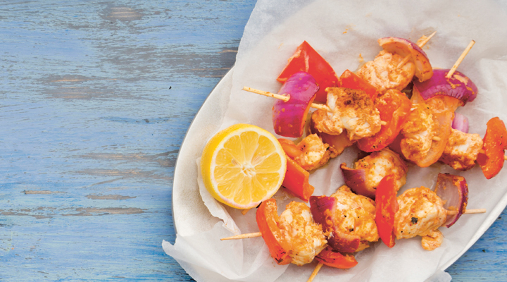 Thread four skewers with alternating layers of the fish, peppers and onions. Cook on the hot barbecue for 6 minutes on each side.