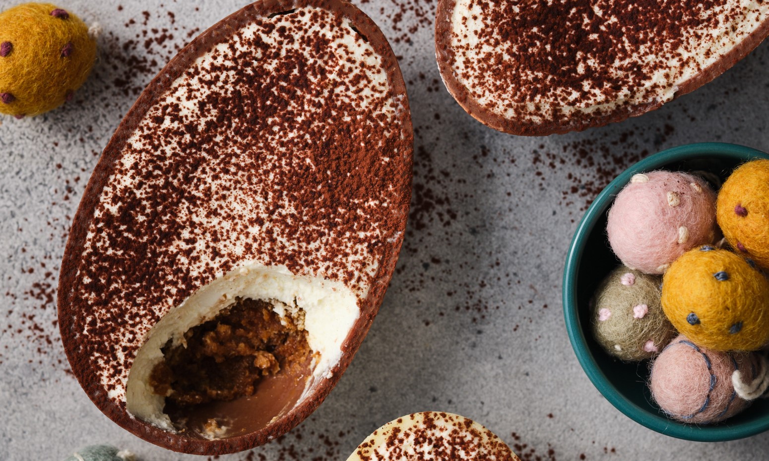 Dust the top of each Easter egg with a generous coating of cocoa powder using a sieve, then refrigerate for three hours or overnight before serving.