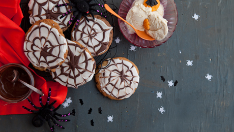 Drizzle the cookies with the white icing, then swirl the dark chocolate in a circular fashion over the white icing, then using the tip of a cocktail stick make a web pattern by dragging the tip through the dark chocolate.