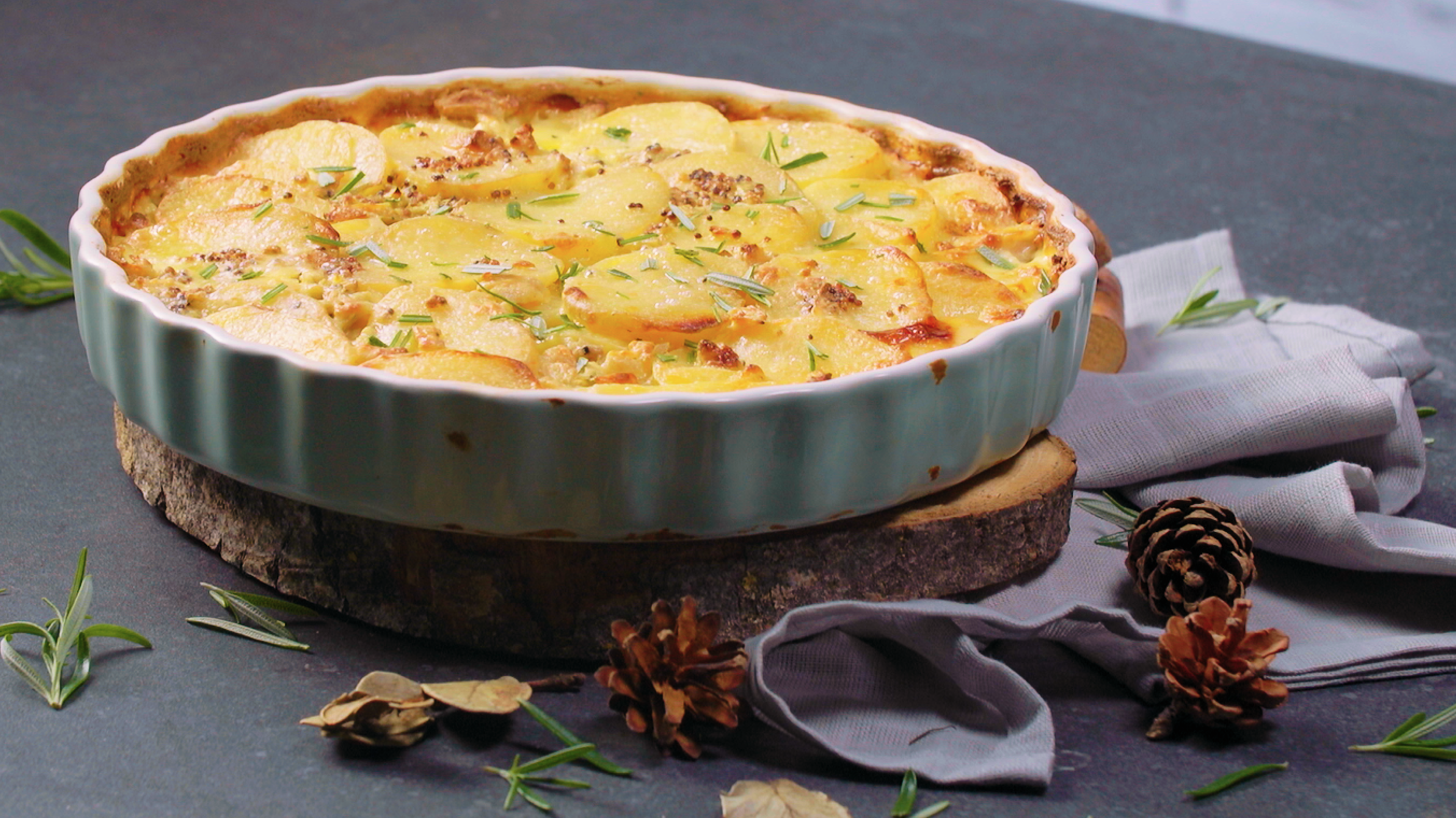 Layer the potatoes in a deep ceramic baking dish.