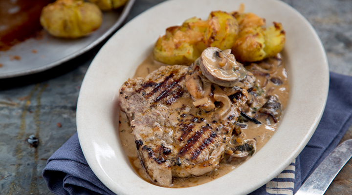 5. Serve the T-bone pork chops with the parmesan potatoes and spoon over the black pepper and mushroom sauce.